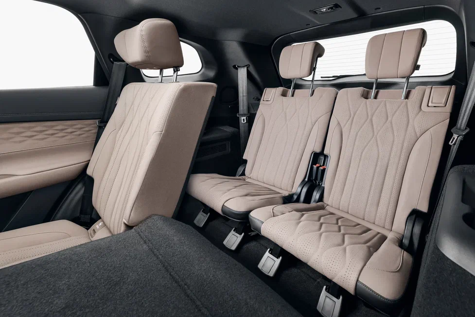 Внутри ровно то, что ждёшь: мягкие панели, крупный экран, CarPlay/Android Auto по воздуху, круговые камеры и весь зимний набор с подогревом, включая лобовое и форсунки. Но нюансы есть: подушка водительского сиденья коротковата, а посадка для высоких — выше желаемого, у переднего пассажира регулировки по высоте нет. Семиместная версия скорее выглядит, как «плюс два детских». С поднятым третьим рядом багажник смешные 193 л, зато в пятиместной конфигурации почти 900 л под потолок.